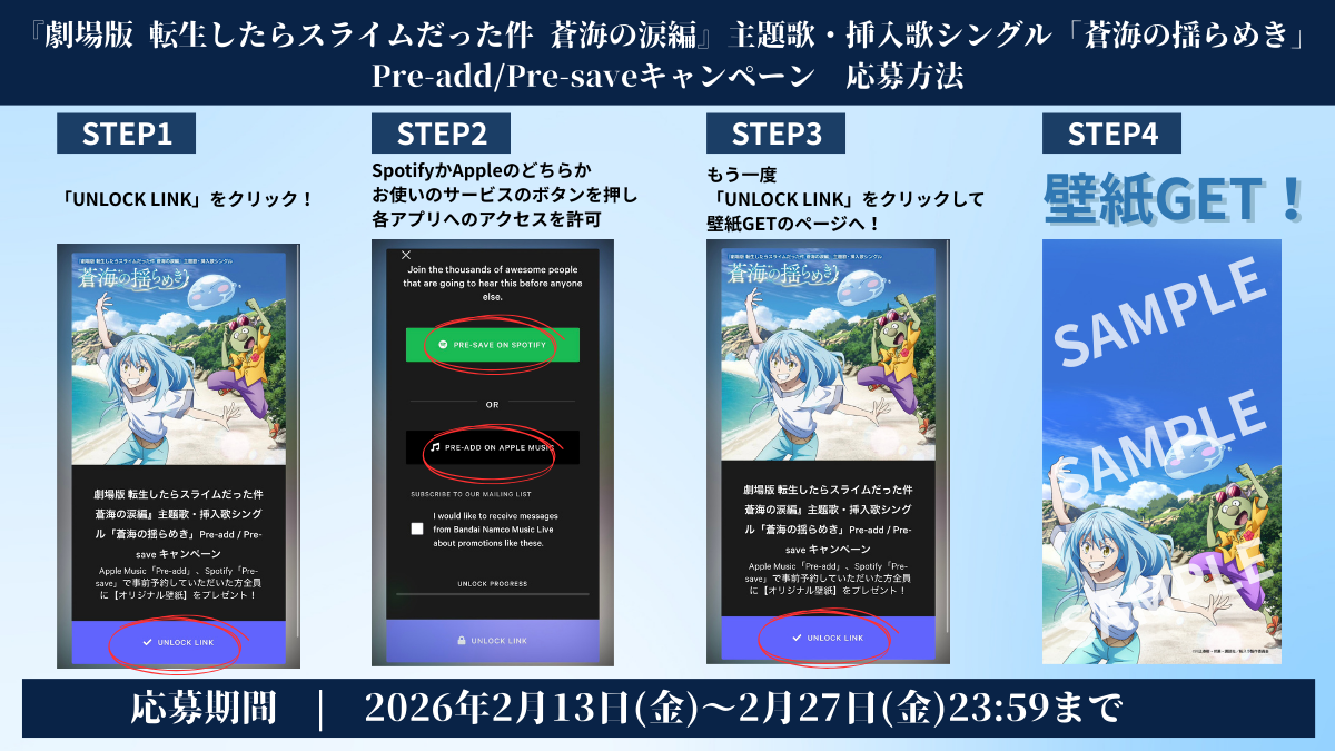 『劇場版 転生したらスライムだった件 蒼海の涙編』主題歌・挿入歌シングル「蒼海の揺らめき」リリースを記念して、期間内にApple MusicもしくはSpotifyにて事前予約をしていただいた方全員に、【オリジナル壁紙】をプレゼント!